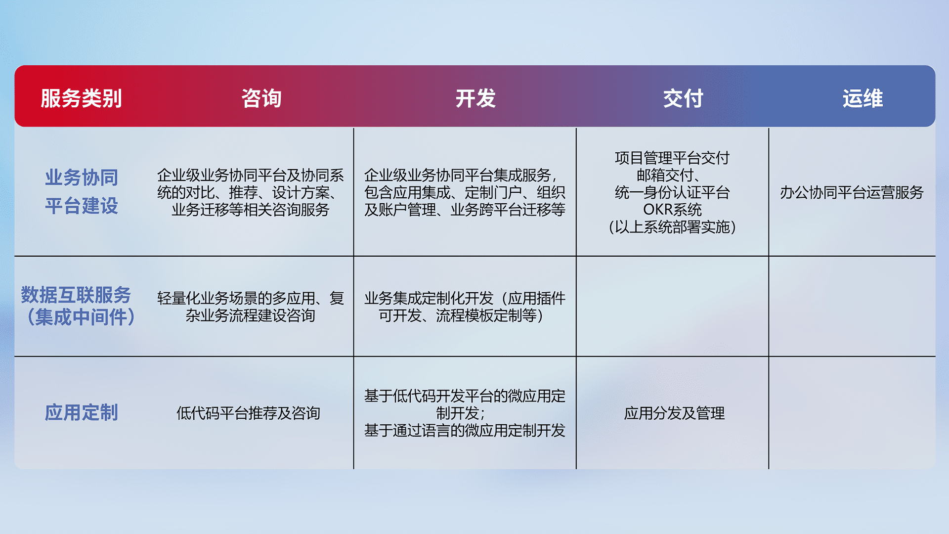 针对钉钉、、企微、、、IDaas等平台级产品提供产品的规划、、、方案、、、、交付、、定制化开发等服务,,,,实现如统一协同办公、、智能客户服务、、混合会议管理、、、、智能数据查询、、等业务场景,,,实现数字化转型。。。